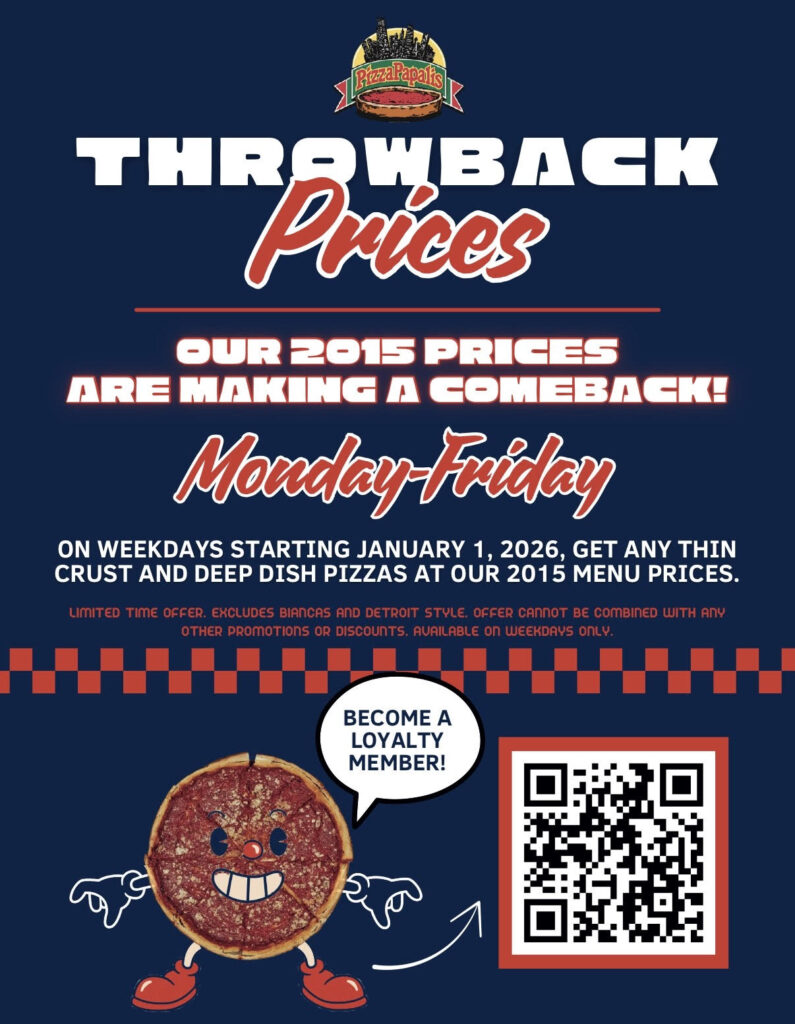 You’re missing out on dollars off future orders if you don’t join the PizzaPapalis Loyalty Club! As a loyal member, you’ll earn points for every dollar spent that can be used to take $5, $10, $20 and more off future orders.
